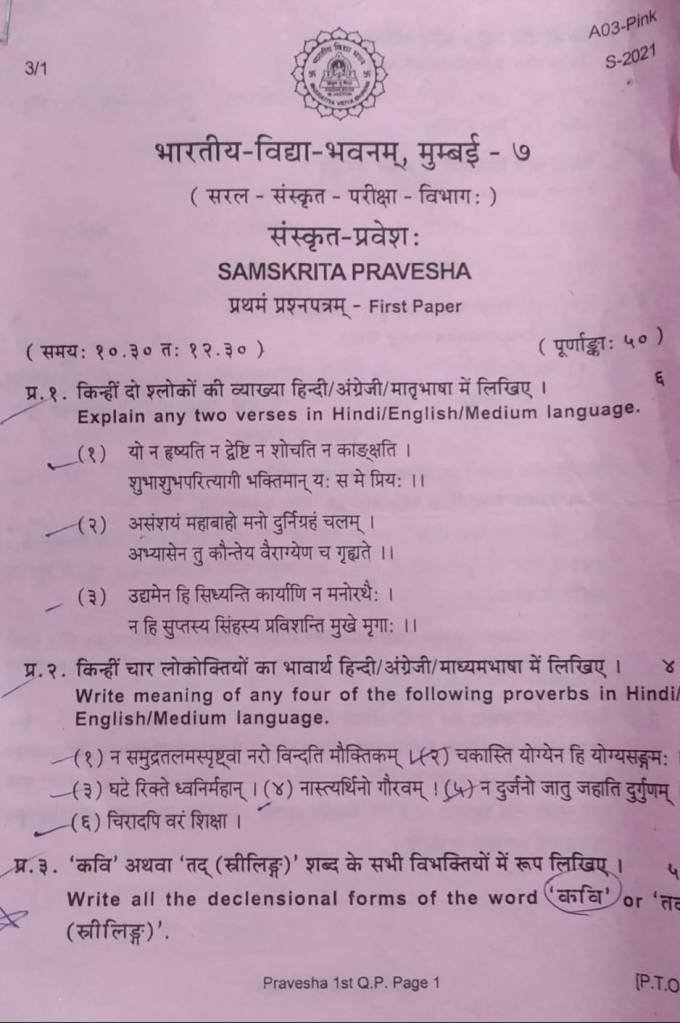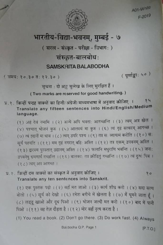भारतीय विद्या भवनम् अतीत परीक्षा पत्र | Bharatiya Vidya Bhavan Past Exam Papers
